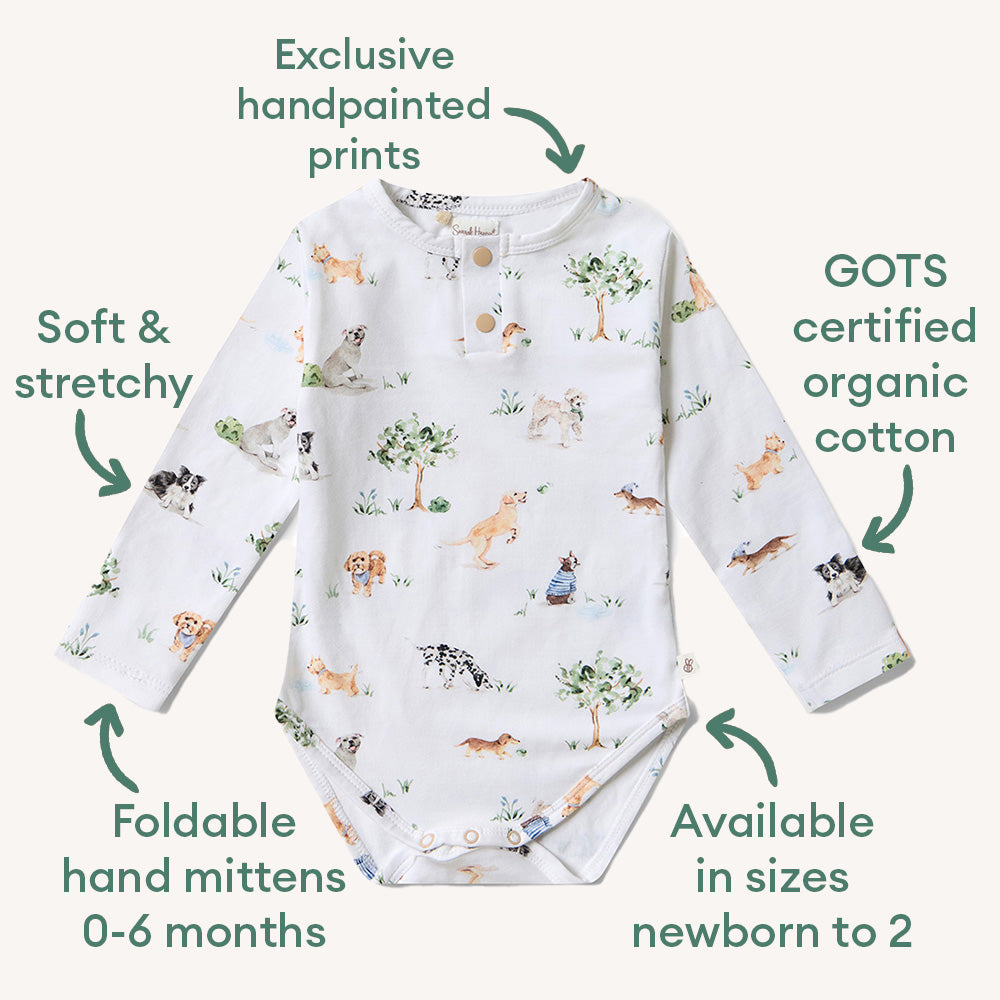 Snuggle Hunny organic bodysuits are made for babies and toddlers. This bodysuit is long-sleeved, and great for cooler days in Summer and Winter under layers. In our Dog Park print.