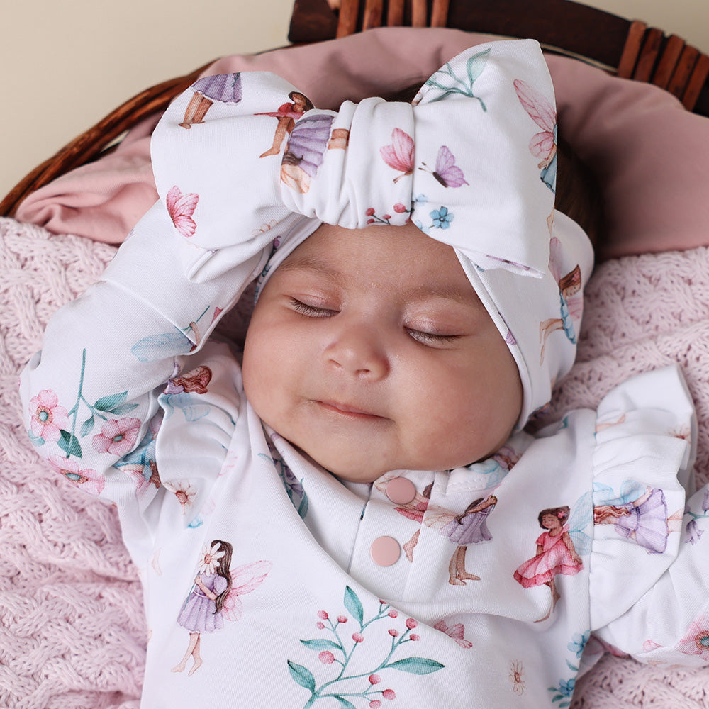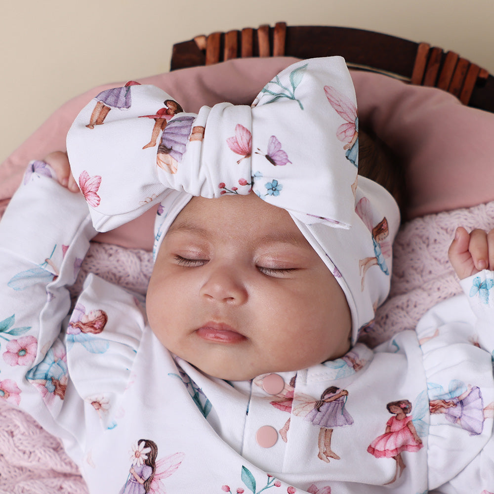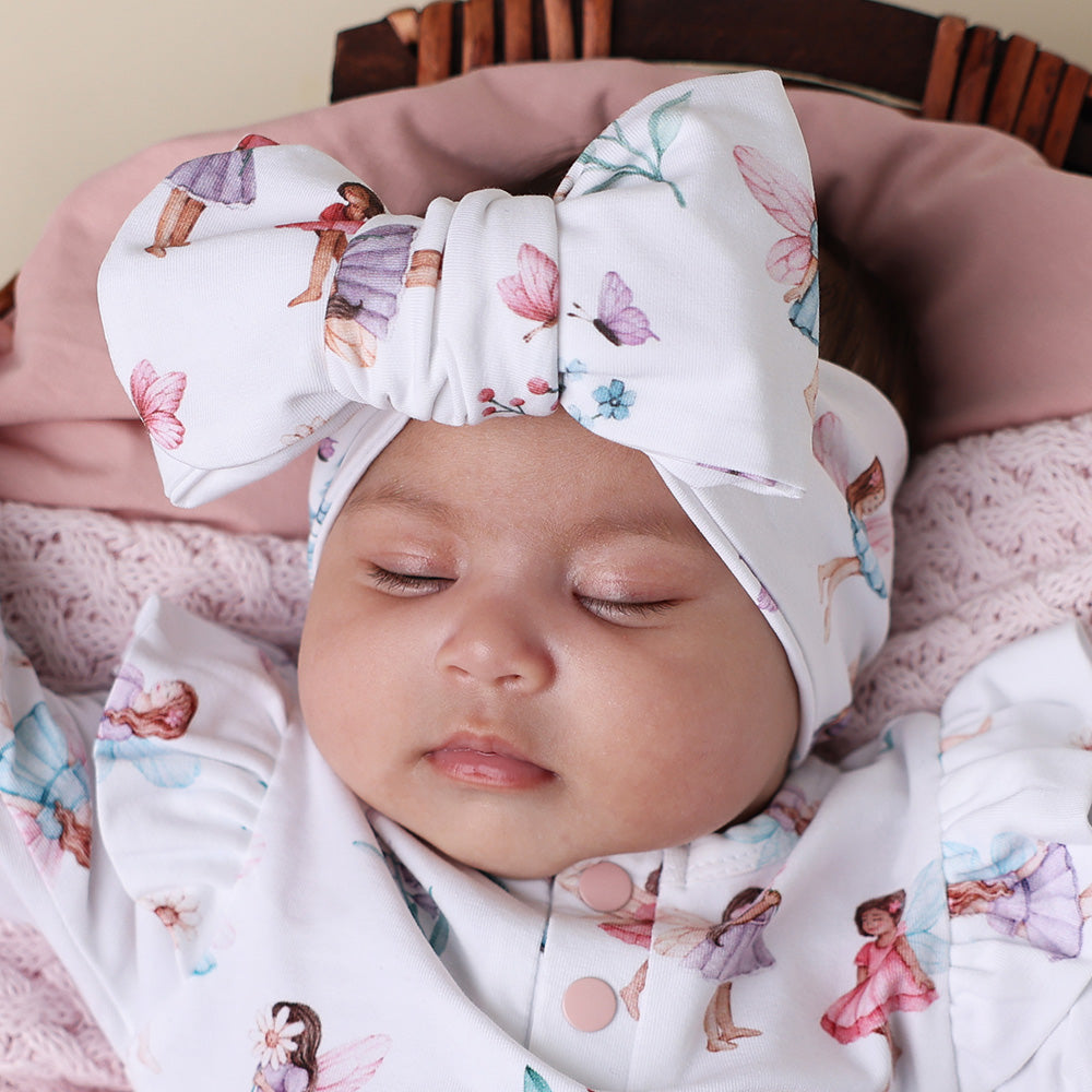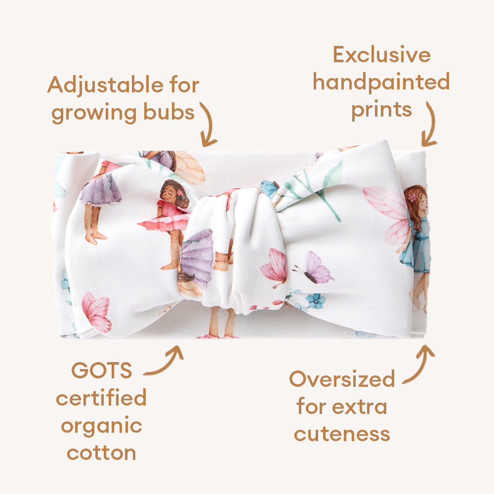 This Fairy Garden oversized bow is soft, stretchy and the perfect way to add cuteness to any outfit for any occasion. Suitable for newborns, babies and toddlers. Made from certified organic cotton jersey.