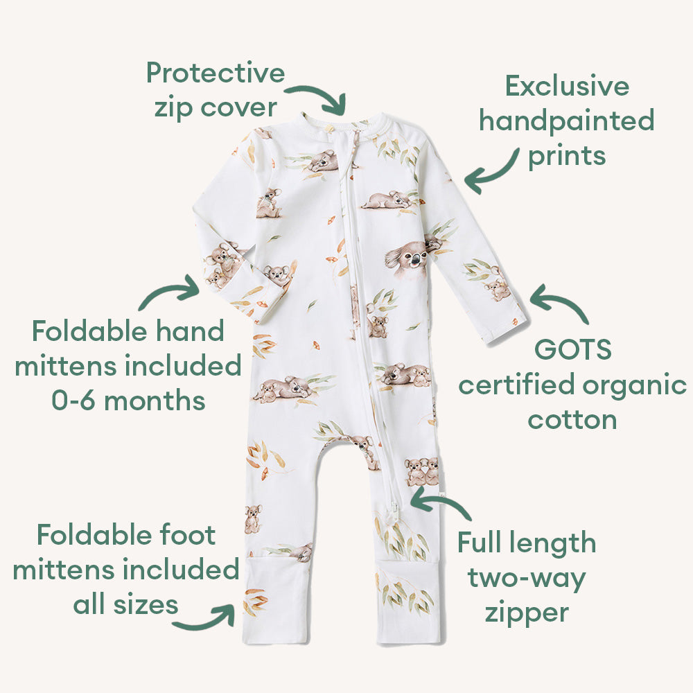 Snuggle Hunny organic Snugglesuits are convertible rompers with two way zips and foldover feet. Made for babies and toddlers, newborn to size 2, in our exclusive Koala print.