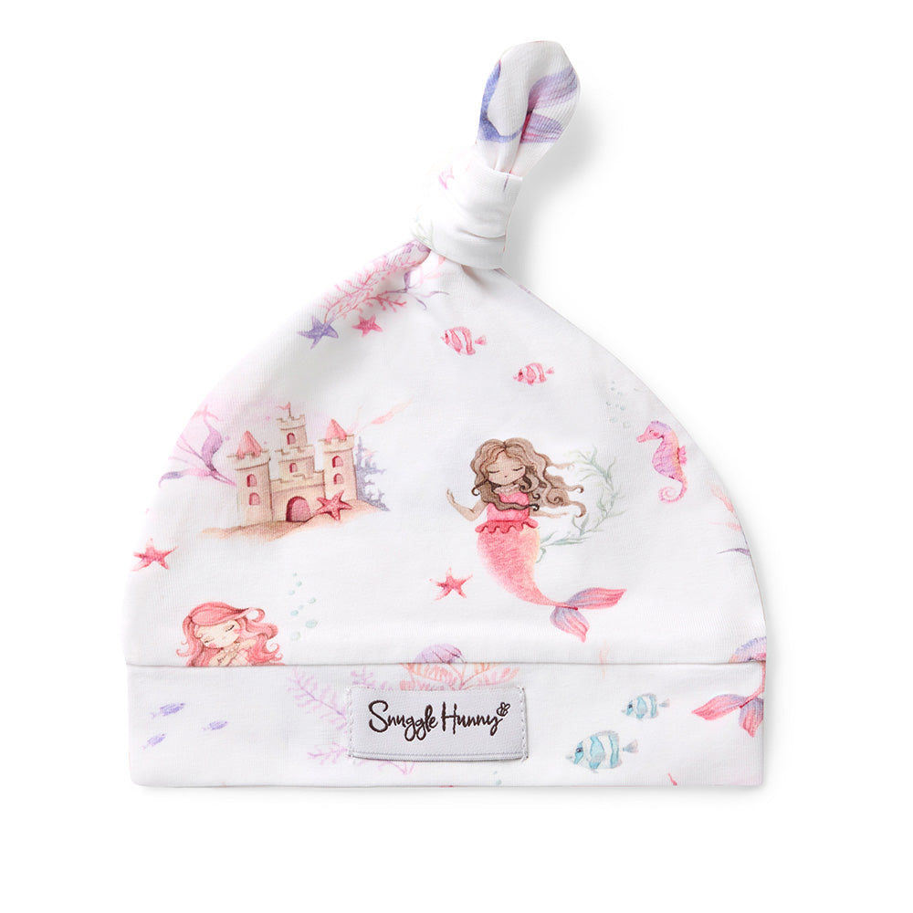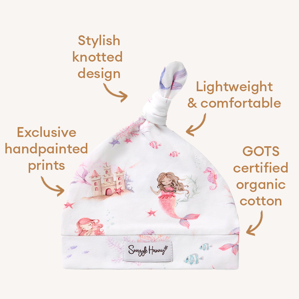 Our Snuggle Hunny Mermaid knotted baby beanie is soft and snuggly and made with Certified Organic cotton so you know bub has only the best. For newborns to 6 months old.