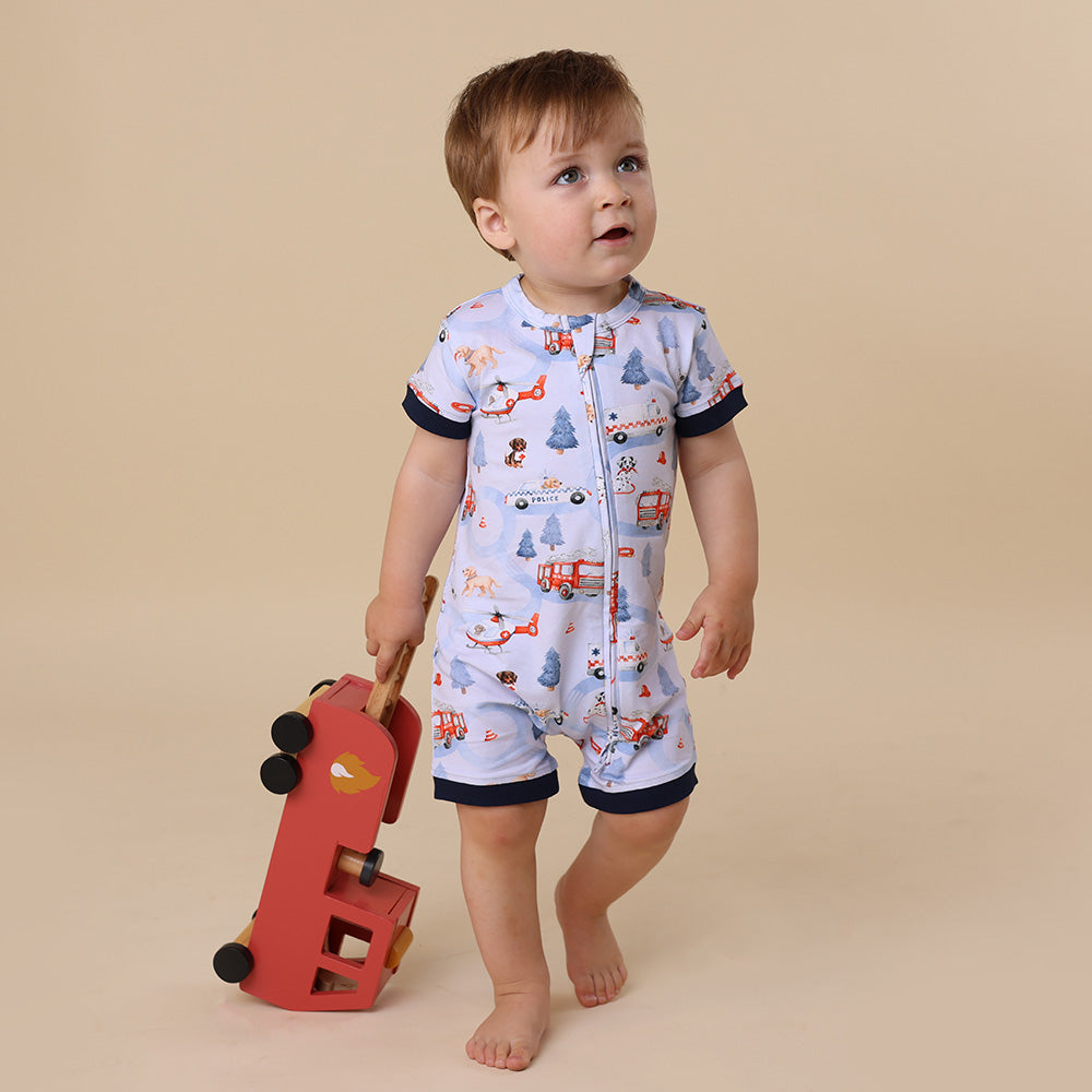 The Snuggle Shortie is a short sleeve 'shortie' romper style available in our exclusive To The Rescue print. This romper is short-sleeved, perfect for warmer weather.